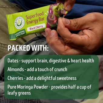 Kuli Kuli Mo is passionate about bringing the power of moringa to your daily routine with delicious and nutritious products. The Black Cherry Moringa Superfood Energy Bar offers a unique blend of wholesome ingredients, giving you a convenient way to enjoy half a cup of leafy greens on-the-go.