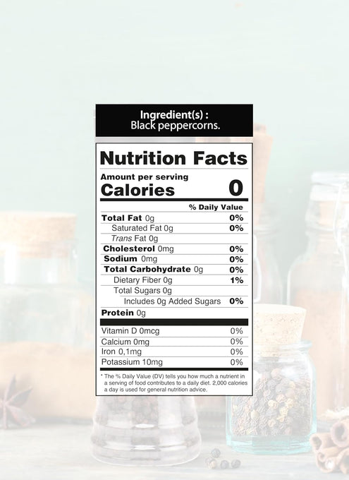 - 100% pure black peppercorns—no artificial additives or preservatives