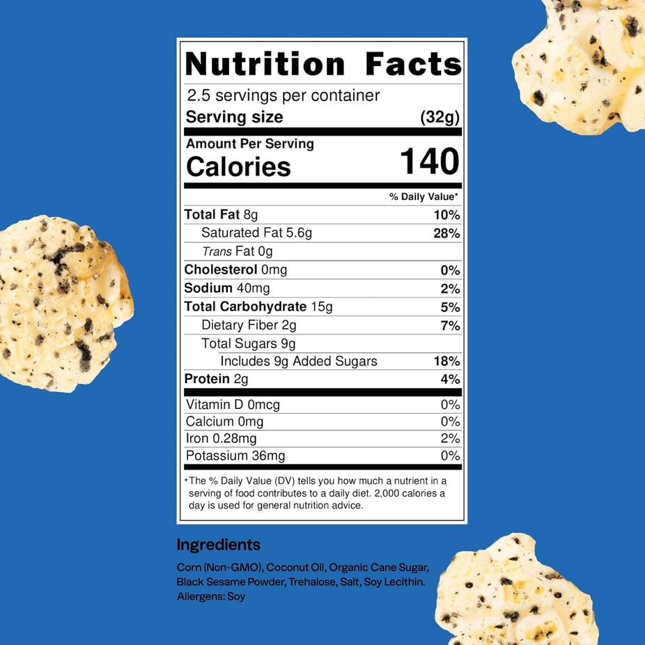 Ingredients: Corn (Non - Gmo), Coconut Oil, Organic Cane Sugar, Black Sesame Powder, Trehalose, Salt, Soy Lecithin.