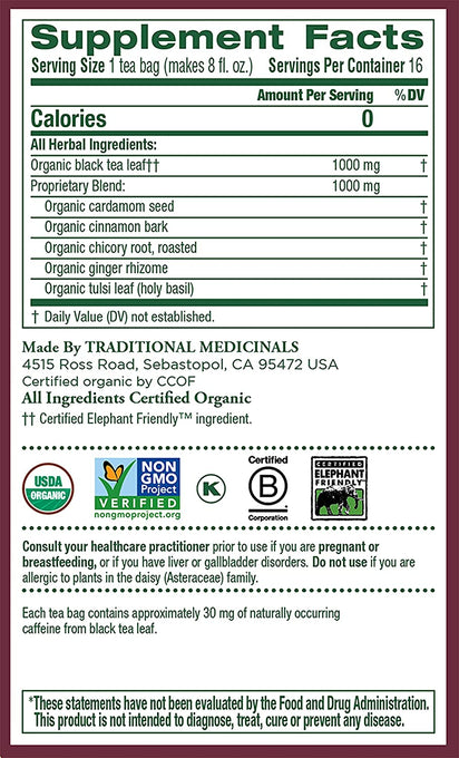 Ingredients: Organic Black Tea Leaf, Organic Cardamom Seed, Organic Cinnamon Bark, Organic Chicory Root Roasted, Organic Ginger Rhizome, Organic Tulsi Leaf (Holy Basil)