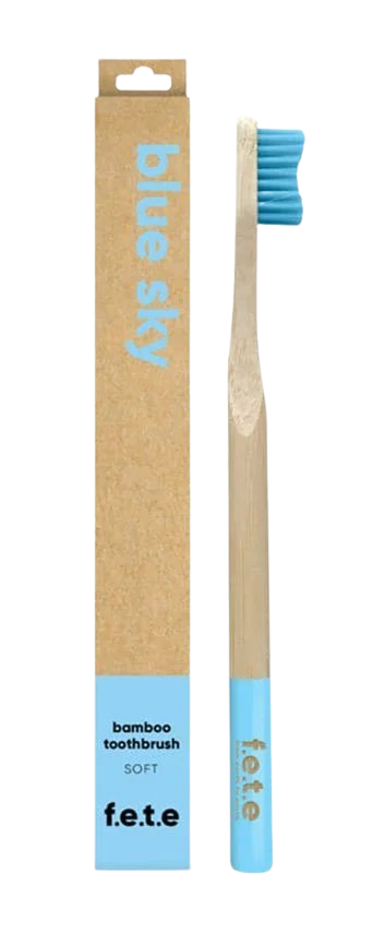 Make your oral care routine eco-friendly with the FETE Blue Adult Medium Bamboo Toothbrush. This adult-sized bamboo toothbrush is biodegradable, home compostable, and has recyclable bristles made from 63% plant-based materials. Its ergonomic design ensures comfort, while the vibrant blue details adds a touch of style.