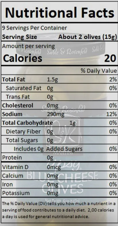 Ingredients: olives, water, blue cheese (pasteurized cultured milk, water, cream, whey, sodium phosphate, salt, titanium dioxide, guar gum, enzymes), salt, lactic acid, sodium benzoate (preservative).