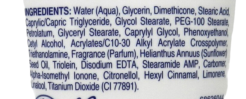 Ingredients: Glycerin, Dimethicone, Stearic Acid, Caprylic/capric Triglyceride, Glycol Stearate, Peg-100 Stearate, Petrolatum, Glyceryl Stearate, Caprylyl Glycol, Phenoxyethanol, Cetyl Alcohol, Acrylates/c10-30 Alkyl Acrylate Crosspolymer, Triethanolamine, Triolein, Disodium Edta, Stearamide Amp, Carbomer, Alpha-isomethyl Ionone, Citronellol, Hexyl Cinnamal, Limonene, Linalool, Titanium Dioxide (Ci 77891), Water, Parfum (Fragrance), helianthus Annuus Seed Oil.