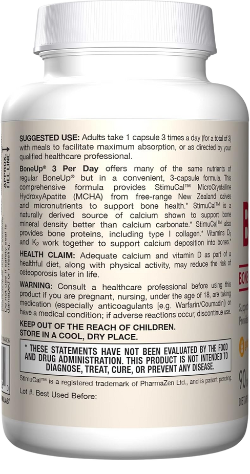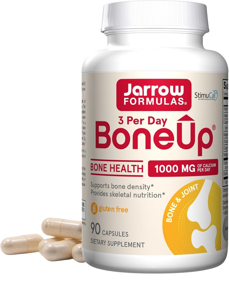Bone Support Supplement: One 90 count bottle of Jarrow Formulas BoneUp Three Per Day bone density support for adults(1). When taking 3 capsules per day this bone strength supplement contains 200 mg of vitamin C, 25 mcg of vitamin D, 1000 mg of calcium from MCHA, and more.