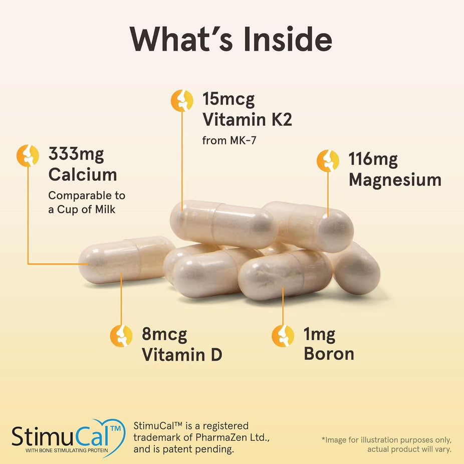 Ingredients: Vitamin C (as Ascorbic Acid), Vitamin D (as D3 Cholecalciferol), Calcium (Elemental) (from Microcrystalline Hydroxyapatite), Magnesium (as Magnesium Oxide), Zinc (as Zinc L-Methionine Sulfate), Copper (as Copper Gluconate), Manganese (as Manganese Citrate), Vitamin K2 (as Natural MK-7 [Menaquinone-7]), Boron (as Boron Citrate), Other Ingredients: Capsule (bovine gelatin [BSE free]), magnesium stearate (vegetable source) and silicon dioxide.