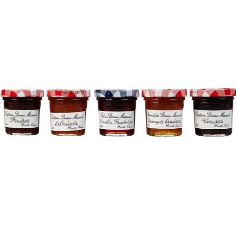Ingredients: Apricot spread - ingredients: apricots, sugar, cane sugar, concentrated lemon juice, gelling agent: fruit pectin. an occasional pit may be present. prepared with 50g fruits per 100g finished product. total sugars content: 60g per 100g. cherry spread - ingredients: cherries, sugar, cane sugar, concentrated lemon juice, gelling agent: fruit pectin. an occasional pit may be present. prepared with 50g fruits per 100g finished product. total sugars content: 60g per 100g strawberry spread - ingredients: strawberries, sugar, cane sugar, concentrated lemon juice, gelling agent: fruit pectin. prepared with 50g fruits per 100g finished product. total sugars content: 60g per 100g. orange spread - ingredients: sugar, oranges, cane sugar, concentrated lemon juice, gelling agent: fruit pectin. prepared with 28g fruits per 100g finished product. total sugars content: 60g per 100g. red currant raspberry jelly- ingredients: fruits (redcurrants, raspberries), sugar, cane sugar, concentrated lemon juice, gelling agent: fruit pectin. prepared with 50g fruits per 100g finished product. total sugars content 60g per 100g.
