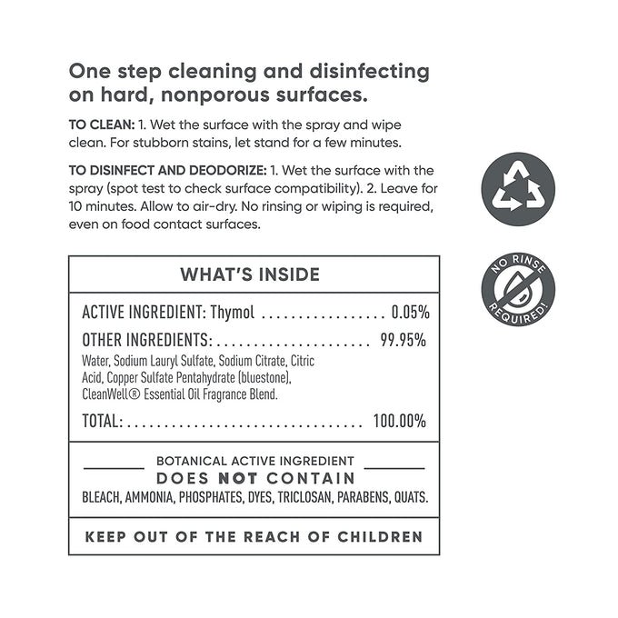 Ingredients: Active Ingredient: Thymol 0.05% // Other Ingredients: Water, Sodium Lauryl Sulfate, Copper Sulfate Pentahydrate (Bluestone), Citric Acid, Sodium Citrate, Cleanwell® Essential Oil Fragrance Blend.