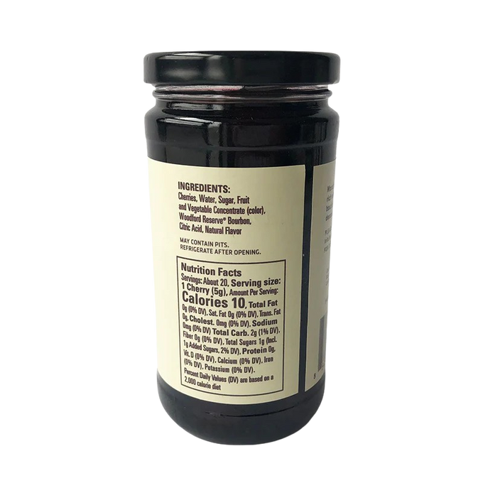 Ingredients: Cherries, water, sugar, Woodford Reserve Bourbon, fruit and vegetable concentrate (color), citric acid, malic acid, natural flavors. Contains Alcohol