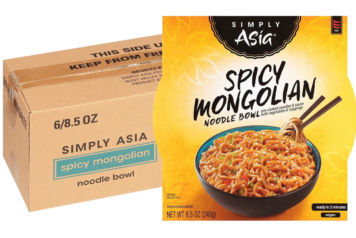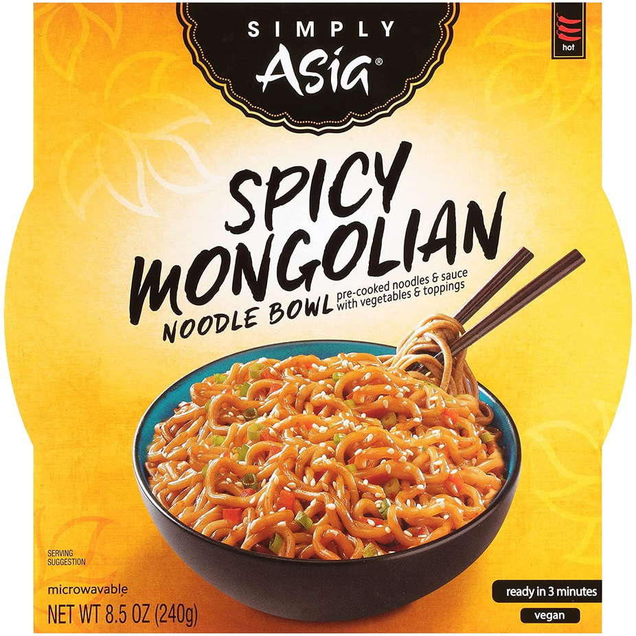Simply Asia Spicy Mongolian Noodle Bowl is a quick, microwaveable Asian-style noodle meal featuring a sweet-spicy Mongolian sauce with soy, chili, sesame, and garlic flavors. It is sold as an 8.5 oz single-serve bowl that is ready in about 3 minutes after adding a small amount of water.