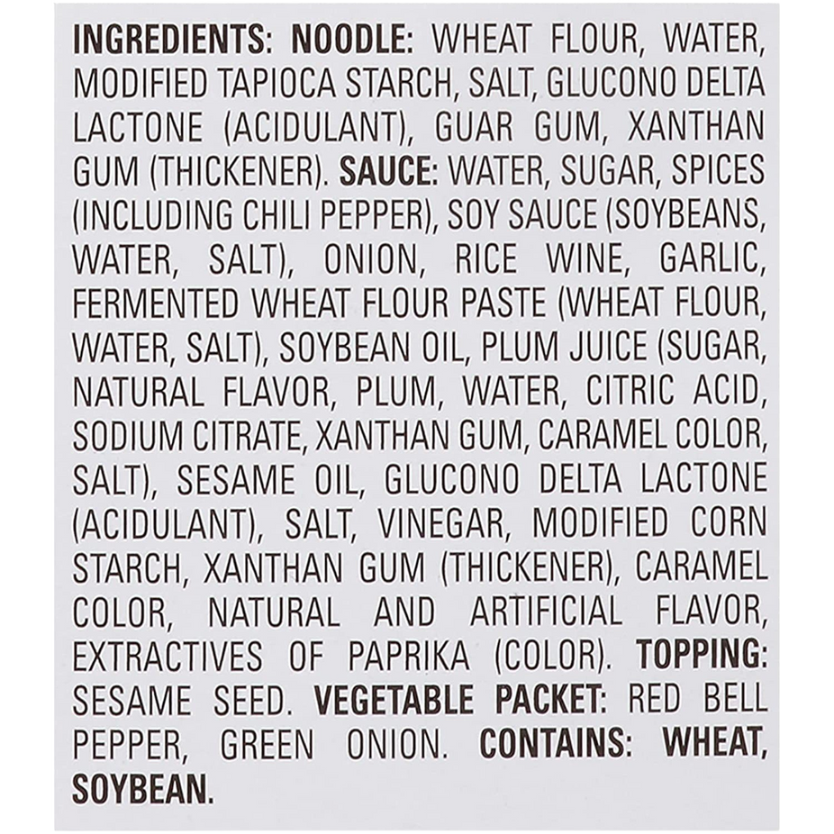 Ingredients: Noodle: Wheat Flour, Water, Modified Tapioca Starch, Salt, Glucono Delta-Lactone, Guar Gum, And Xanthan Gum. Sauce: Water, Sugar, Soy Sauce (Water, Salt, Soybean), Chili Pepper Paste (Chili Pepper, Salt), Onion, Rice Wine, Garlic, Spice (Including Red Chili Pepper), Soybean Oil, Plum Sauce (Sugar, Plum, Water, Natural Flavor, Citric Acid, Sodium Citrate, Salt, Xanthan Gum, And Caramel Color), Fermented Wheat Flour Paste (Water, Salt, Wheat Flour), Vinegar, Sesame Oil, Glucono Delta-Lactone, Modified Corn Starch, Xanthan Gum, Natural Flavor, Caramel Color, Extractives Of Paprika (Color). Vegetable Packet: Red Bell Peppers, Green Onion. Topping: Toasted Sesame Seeds.