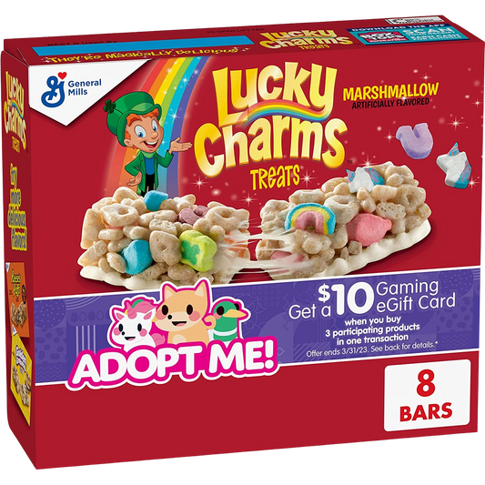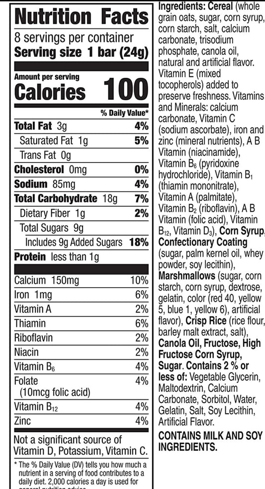Ingredients: Cereal (whole grain oats, sugar, corn syrup, corn starch, salt, calcium carbonate, trisodium phosphate, canola oil, natural and artificial flavor. Vitamin E (mixed tocopherols) added to preserve freshness. Vitamins and Minerals: calcium carbonate, Vitamin C (Sodium Ascorbate), iron and zinc (mineral nutrients), A B Vitamin (Niacinamide), Vitamin B6 (Pyridoxine Hydrochloride), Vitamin B1 (Thiamin Mononitrate), Vitamin A (palmitate), Vitamin B2 (Riboflavin), A B Vitamin (folic acid), Vitamin B12, Vitamin D3), Corn Syrup, Confectionery Coating (sugar, palm kernel oil, whey powder, soy lecithin), Marshmallows (sugar, corn starch, corn syrup, dextrose, gelatin, color (red 40, yellow 5, blue 1, yellow 6), artificial flavor), Crisp Rice (rice flour, barley malt extract, Salt), Canola Oil, Fructose, High Fructose Corn Syrup, Sugar. Contains 2 % or less of: Vegetable Glycerin, Maltodextrin, Calcium Carbonate, Sorbitol, Water, Gelatin, Salt, Soy Lecithin, Artificial Flavor.