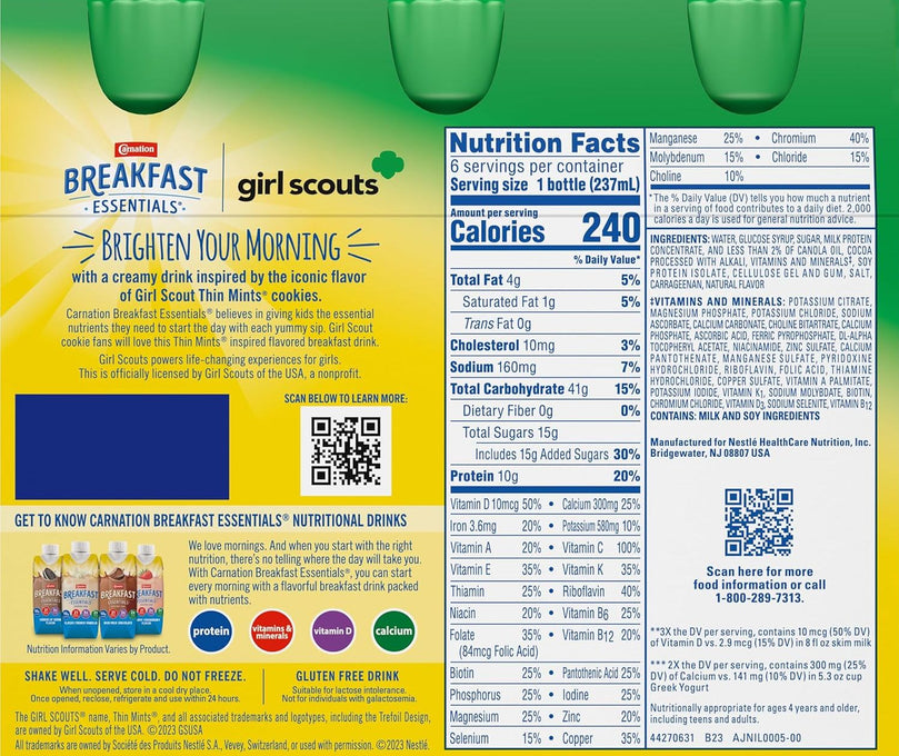 Carnation is renowned for its delicious and nutritious breakfast solutions that make mornings easy and enjoyable. Breakfast Essentials Girl Scout Thin Mints offers a delightful way to start your day with flavors inspired by your favorite Girl Scout cookies.