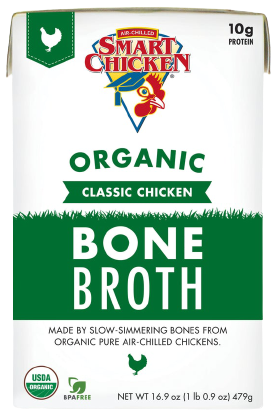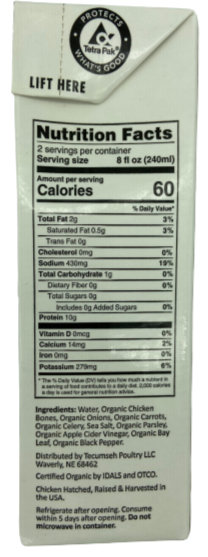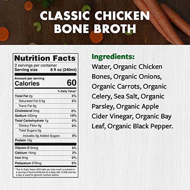 Ingredients: Water, Organic Chicken Bones, Organic Onions, Organic Carrots, Organic Celery, Sea Salt, Organic Parsley, Organic Cider Vinegar, Organic Bay Leaf, Organic Black Pepper.