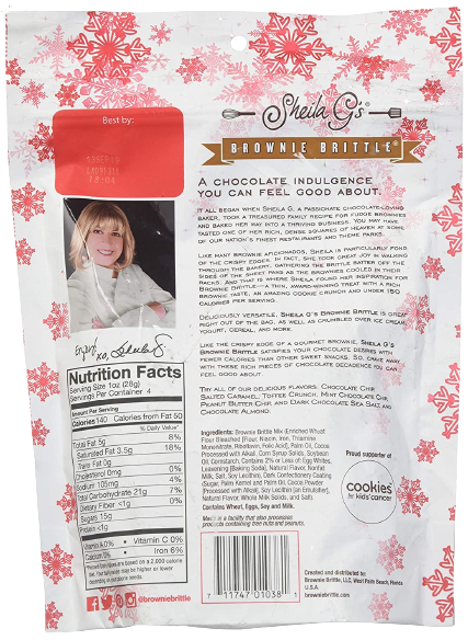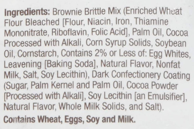 Ingredients: Brownie Brittle Mix (Enriched Wheat Flour Bleached [Flour, Niacin, Iron, Thiamine Mononitrate, Riboflavin, Folic Acid], Palm Oil, Cocoa Processed With Alkali, Corn Syrup Solids, Soybean Oil, Cornstarch, Contains 2% Or Less Of: Egg Whites, Leavening [Baking Soda], Natural Flavor, Nonfat Milk, Salt, Soy Lecithin), Dark Confectionery Coating (Sugar, Palm Kernel And Palm Oil, Cocoa Powder [Processed With Alkali], Soy Lecithin [An Emulsifier], Natural Flavor, Whole Milk Solids, And Salt).