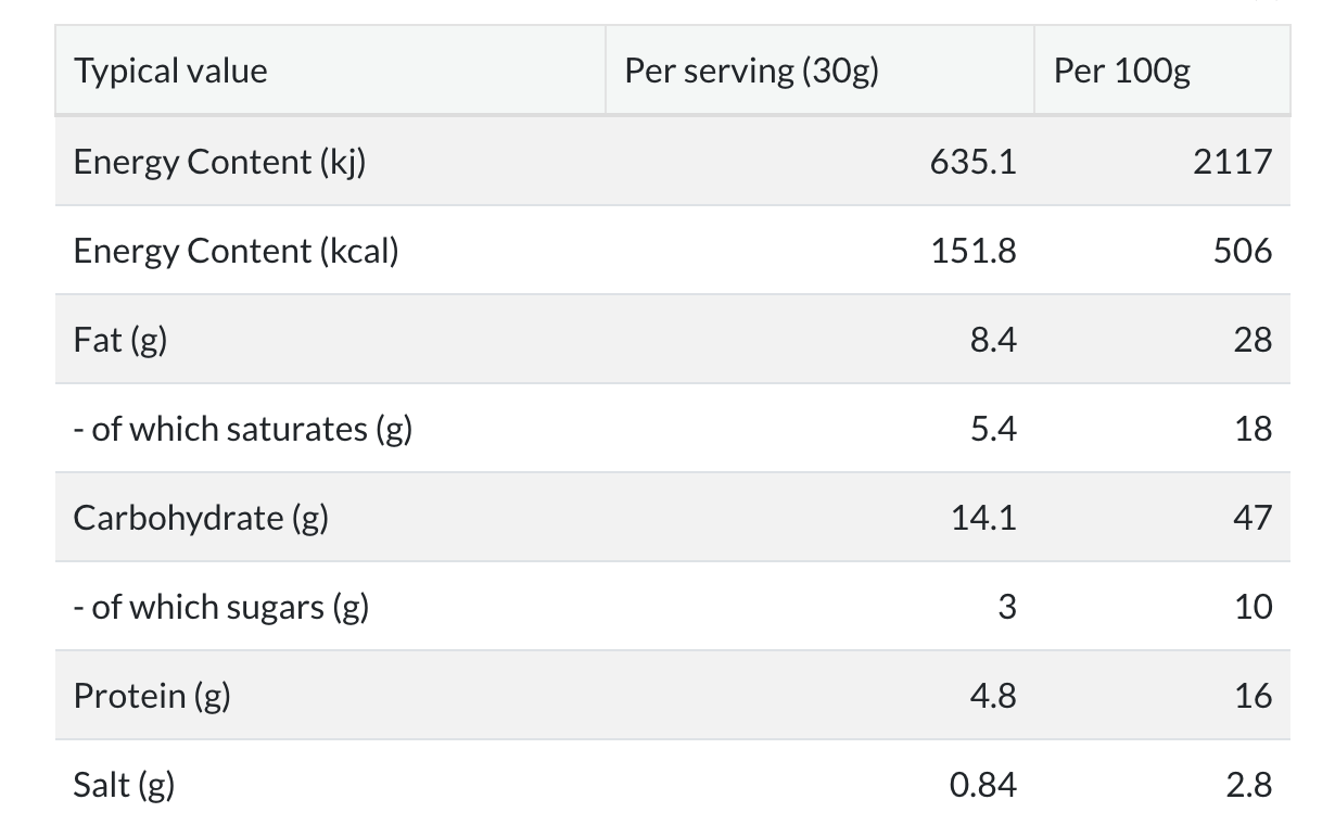 Ingredients: Maroilles cheese PDO(milk) 41%, wheat flour, glucose syrup, butter 13%, wholemilk powder, whole eggs, salt, wheat fiber, natural flavor. Milk of EU orgin. Manufactured in a factory that uses nuts.