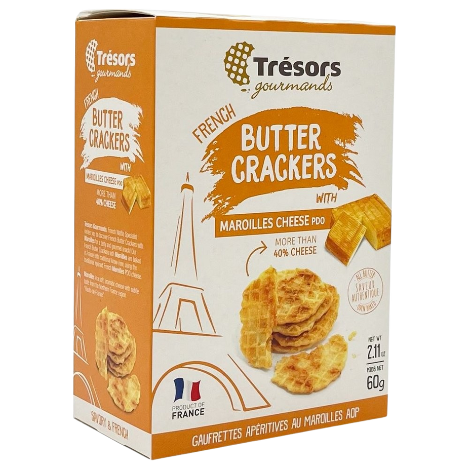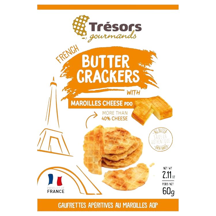 French butter crackers with maroilles are baked in France with traditional know-how, using the traditional ripened French maroilles PDO cheese. Maroilles is a soft, aromatic cheese with subtle taste from the Northen France region 'Hauts-de-France'.