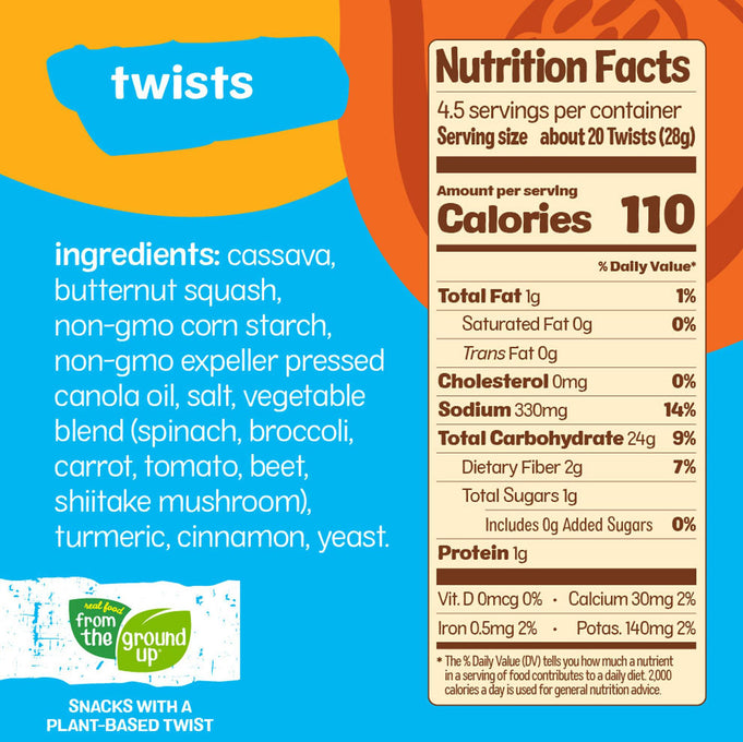 Ingredients: Cassava, Butternut Squash, Non-gmo Corn Starch, Non-gmo Expeller Pressed Canola Oil, Salt, Vegetable Blend (Spinach, Broccoli, Carrot, Tomato, Beet, Shiitake Mushroom), Turmeric, Cinnamon, Yeast.