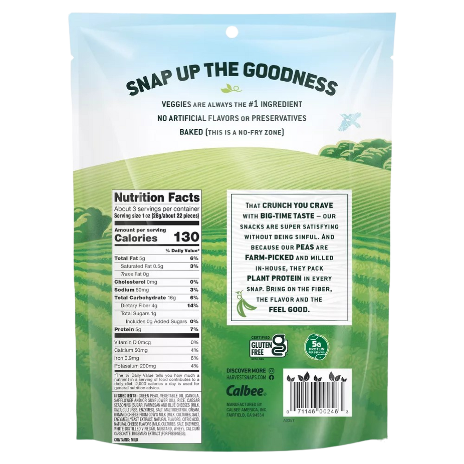 Ingredients: Green Peas, Canola Oil, Rice, Caesar Seasoning (Sugar, Parmesan And Blue Cheese [milk, Salt, Enzymes], Salt, Maltodextrin, Cream, Romano Cheese From Cow's Milk [milk,cultures, Salt, Enzymes], Yeast Extract, Natural Flavors, Citric Acid, Natural Cheese Flavors [milk, Cultures, Salt, Enzymes], White Distilled Vinegar, Mustard, Whey), Calcium Carbonate, Rosemary Extract (For Freshness).