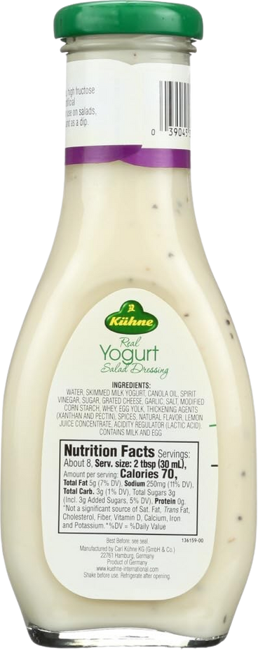Ingredients: Water, Skimmed Milk Yogurt, Canola Oil, Spirit Vinegar, Sugar, Grated Cheese, Garlic, Salt, Modified Corn Starch, Whey, Egg Yolk, Thickening Agents (xanthan And Pectin), Spices, Natural Flavor, Lemon Juice Concentrate, Acidity Regulator (lactic Acid).