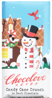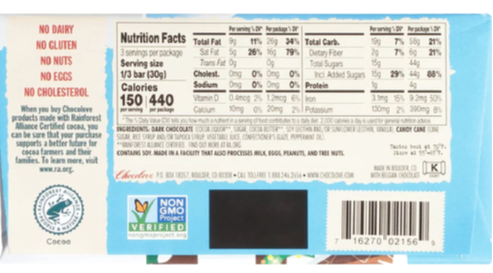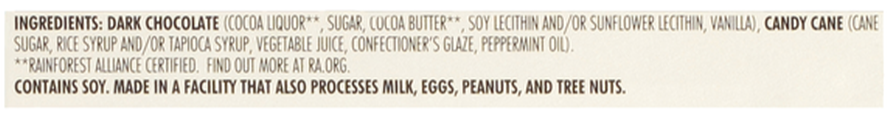 Ingredients: Dark Chocolate (Cocoa Liquor**, Sugar, Cocoa Butter**, Soy Lecithin And/Or Sunflower Lecithin, Vanilla), Candy Cane (Cane Sugar, Tapioca Syrup, Vegetable Juice, Confectioner’S Glaze, Peppermint Oil)
