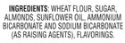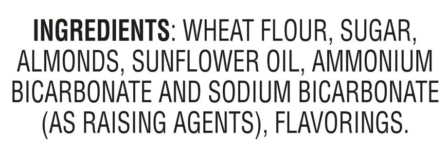Ingredients: Wheat Flour, Sugar, Almonds, Sunflower Oil, Ammonium Bicarbonate And Sodium Bicarbonate (As Raising Agents), Flavorings.