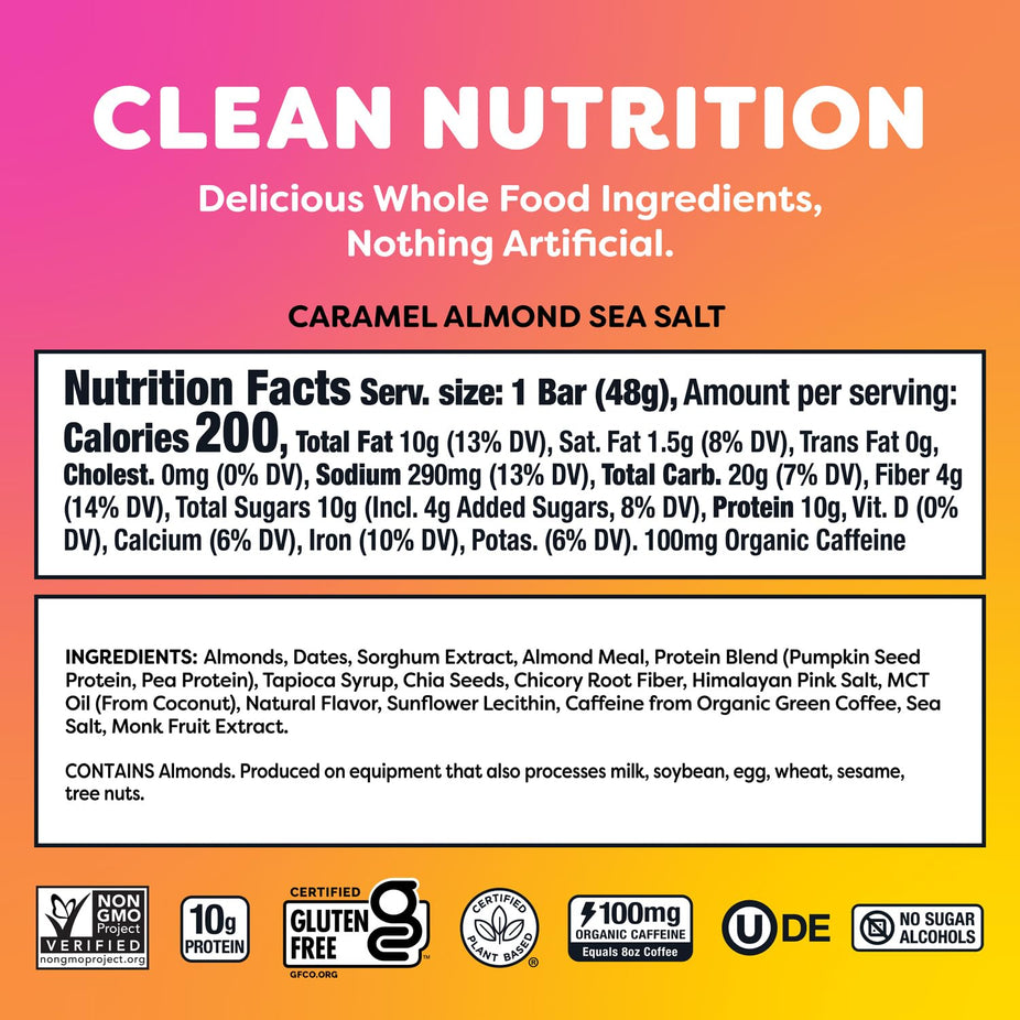 Ingredients: Protein Blend (Pumpkin Seed Protein, Pea Protein), Almonds, Dates, Tapioca Syrup, Sorghum Extract, Chia Seeds, Chicory Root Fiber, Natural Flavors, Mct Oil (From Coconut), Himalayan Pink Salt, Sea, Salt, Sunflower Lecithin, Caffeine From Organic Green Coffee, Monk Fruit, Extract.