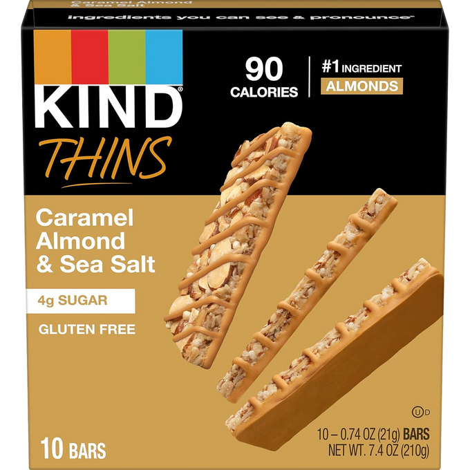 Kind thins caramel almond & sea salt bars are a thinner take on your favorite kind bar. With almonds as the #1 ingredient, these gluten free bars feature a thin layer of sliced almonds with a caramel coating and drizzle. These snack bars contain 4 grams of sugar and 90 calories per serving.