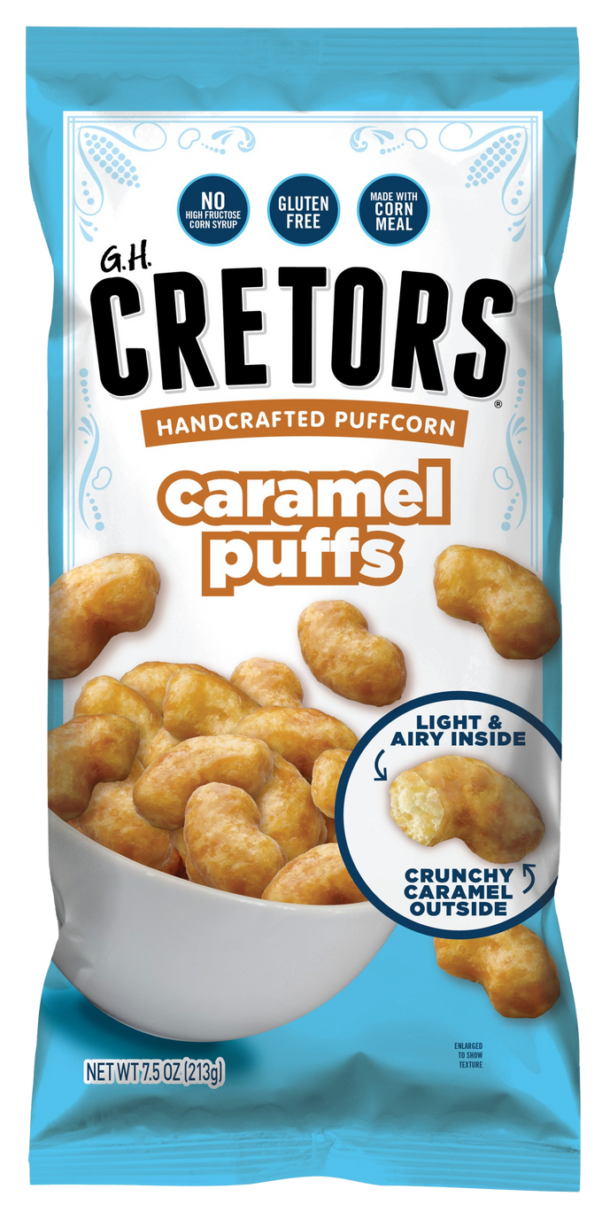 G.H. Cretors Caramel Flavored Corn Puffs deliver a crunchy caramel exterior with a light, airy interior for a truly indulgent snacking experience.