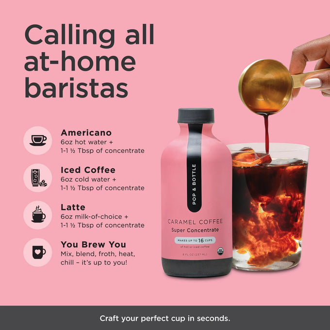 Pop & Bottle Caramel Coffee Super Concentrate delivers rich caramel notes in a smooth, customizable brew—no coffee machine required. Calling All At-Home Baristas Craft the perfect cup in seconds with just 1 Tablespoon of Instant Cold Brew. Less is more thanks to Pop & Bottle Instant Cold Brew. With a subtle caramel flavor and smooth finish, this little bottle works hard so you don’t have to. Whether you take your coffee iced, hot, creamy, sweetened, or pure, Caramel Instant Cold Brew lets you enjoy coffee your way in one simple step.