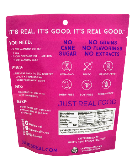 Ingredients: Organic Almond Flour, Organic Coconut Sugar, Organic Cinnamon, Baking Soda, Vanilla Beans, Sea Salt