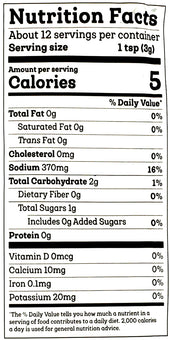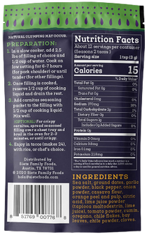 Ingredients: Sea Salt, Ground Dates, Garlic Powder, Black Pepper, Onion Powder, Cassava Flour, Orange Peel And Pulp, Citric Acid, Lime Juice Powder (Tapioca Maltodextrin, Lime Juice), Tomato Powder, Cumin, Oregano, Chile Flakes, Bay Leaves, Chile Powder, Cloves.