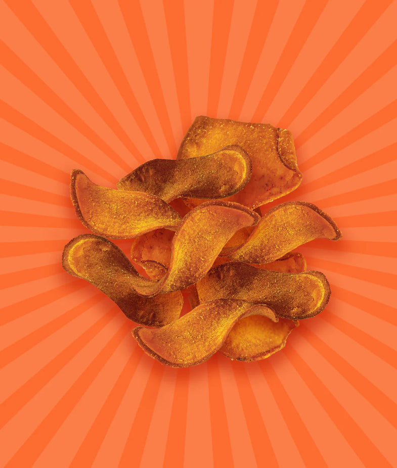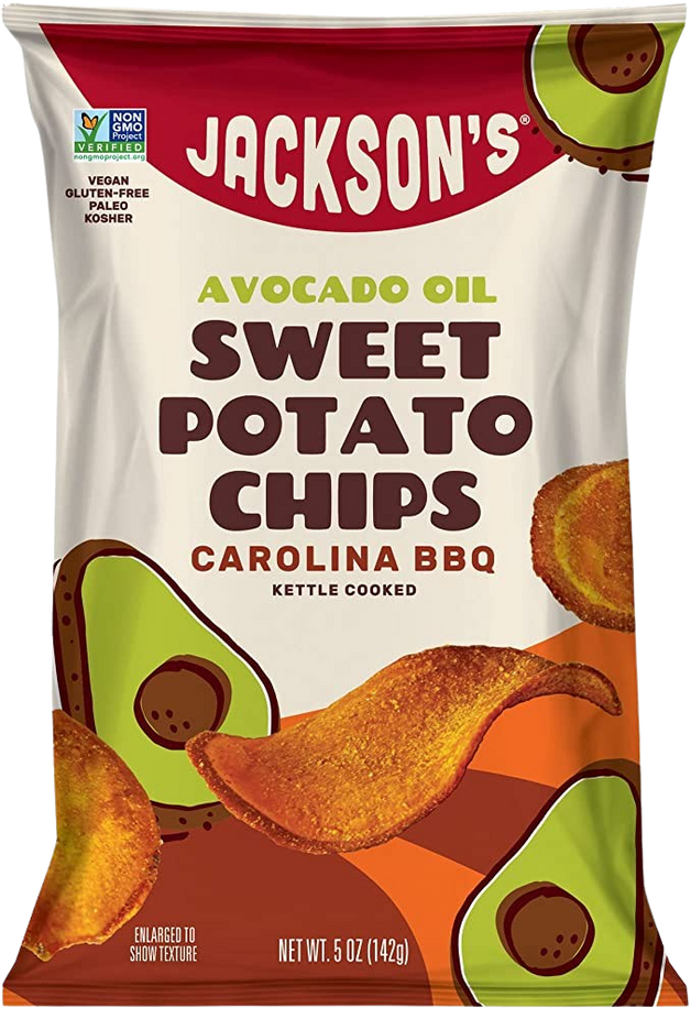 Ingredients: Sweet Potatoes, Avocado Oil, Carolina BBQ Seasoning Blend (Sugar, Vinegar Powder (Maltodextrin, White Dustilled Vinegar), Sea salt, Tomato Powder, Spices, Citric Acid, Torula Yeast, Garlic Powder, Yeast Extract, Extractives of Paprika, Natural Smoke Flavor, Less than 2% of silicon Dioxide Added to Prevent Caking).