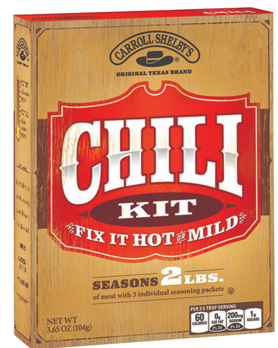 Carroll Shelby's custom chili kit features individual packets of spices, cayenne, masa flour, and salt that let you season two pounds of meat just the way you like.