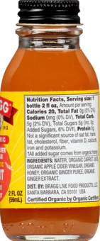 Ingredients: Water, Organic Carrot Juice, Organic Apple Cider Vinegar, Organic Honey, Organic Ginger Puree, Organic Ginger Extract. Traits And Certifications