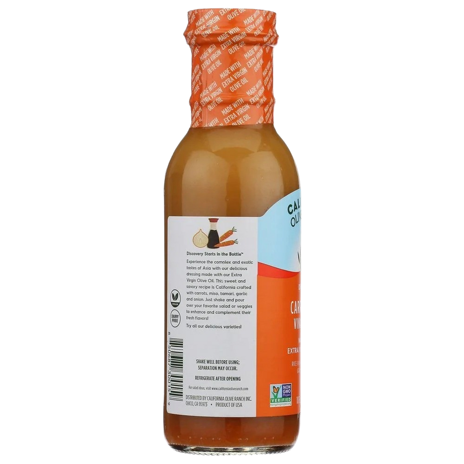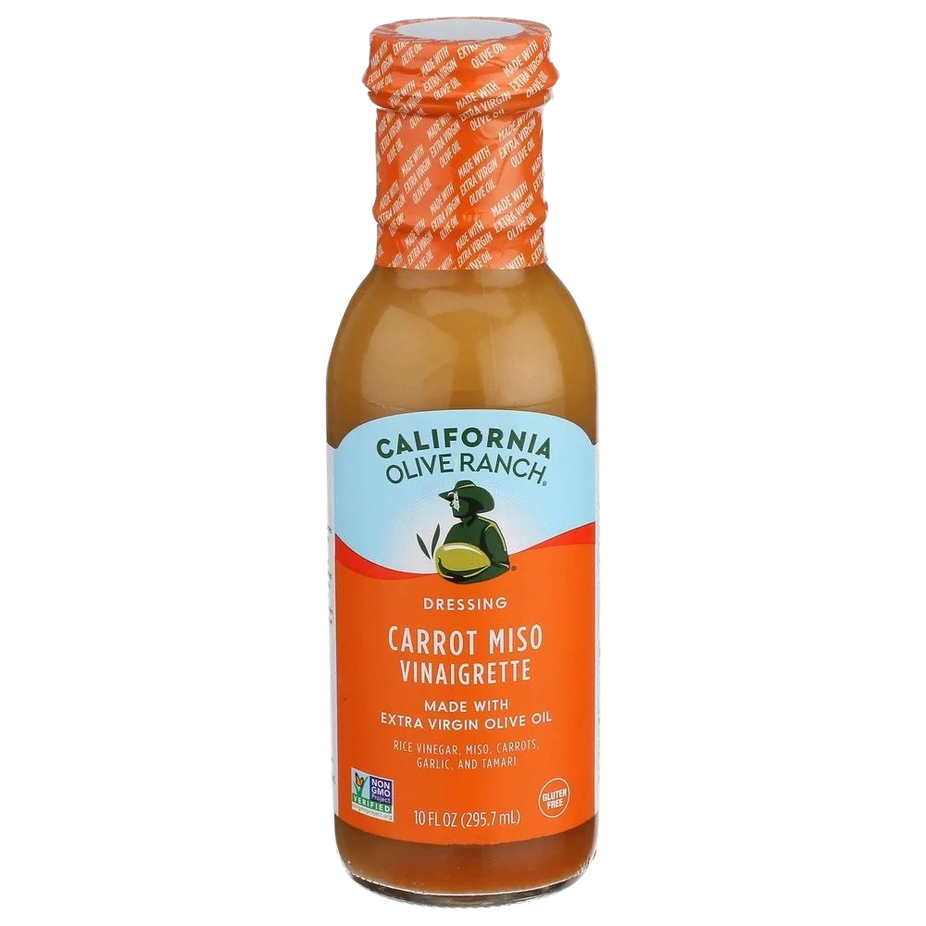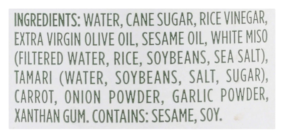 Ingredients: Water, Cane Sugar, Rice Vinegar, Sunflower Oil, Sesame Oil, White Miso (Filtered Water, Soybeans, Rice, Sea Salt), Tamari (Water, Soybeans, Salt, Sugar), Carrot, Extra Virgin Olive Oil, Onion, Xanthan Gum, Garlic Powder.