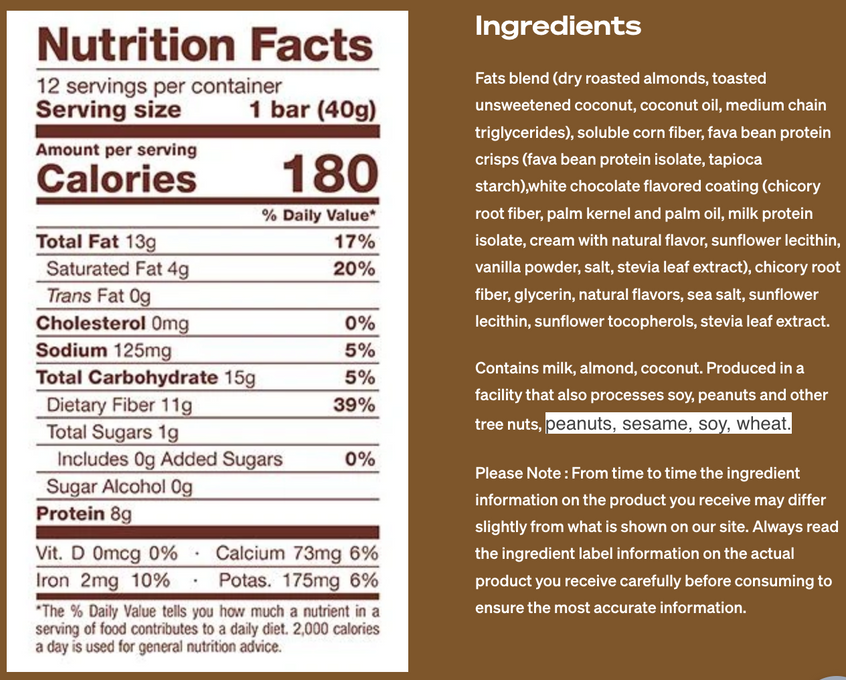 Ingredients: Fats Blend (dry Roasted Almonds, Toasted Unsweetened Coconut, Organic Virgin Coconut Oil, Medium-chain Triglycerides), Tapioca Fiber, Fava Bean Crisps (fava Bean Protein Isolate, Tapioca Starch), White Chocolate Flavored Coating (chicory Root Fiber, Palm Kernel And Palm Oil, Milk Protein Isolate, Cream With Natural Flavor, Sunflower Lecithin, Vanilla Power, Salt, Stevia Leaf Extract), Chicory Root Fiber, Glycerin, Natural Flavor, Sea Salt, Sunflower Tocopherol, Sunflower Lecithin, Stevia Leaf Extract. Contains Milk, Almond, Coconut. Produced In A Facility That Also Processes Egg, Other Tree Nuts, Peanuts, Soy, Wheat.
