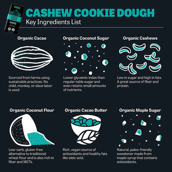 Ingredients: Organic Cacao • Organic Coconut Sugar • Organic Maple Sugar • Organic Coconut Flour • Organic Cashews • Organic Cacao Butter • Organic Coconut Oil • Organic Cinnamon • Himalayan Sea Salt