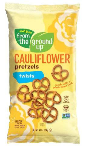 The From The Ground Up Cauliflower Pretzel Twists bring a veggie-forward twist to classic pretzels with crisp crunch, sea-salted flavor, and snackable appeal.