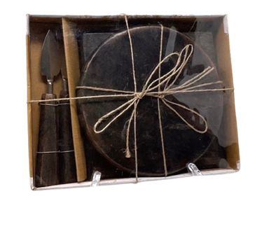 Includes 7.5" round cheese board, 7" x 7" square cheese board, 7" x 1" cheese knife & 7" x 1" cheese spreader, 7" x 1 cheese fork