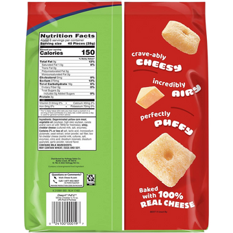 Ingredients: Degerminated Yellow Corn Meal, Vegetable Oil (Soybean, High Oleic Soybean, Canola And/Or Corn Oil With Tbhq For Freshness), Whey, Cheddar Cheese (Cultured Milk, Salt, Enzymes). Contains 2% Or Less Of Salt, Lactic Acid, Monosodium Glutamate, Yeast Extract, Onion Powder, Oat Fiber, Low Fat Cheddar Cheese (Nonfat Milk, Cultures, Salt, Enzymes), Citric Acid, Disodium Inosinate, Disodium Guanylate, Garlic Powder, Natural Flavor.