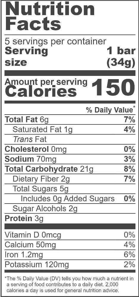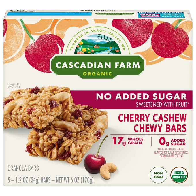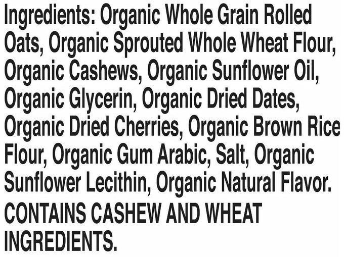 Ingredients: Organic Whole Grain Rolled Oats, Organic Sprouted Whole Wheat Flour, Organic Cashews, Organic Sunflower Oil, Organic Glycerin, Organic Dried Dates, Organic Dried Cherries, Organic Brown Rice Flour, Organic Gum Arabic, Salt, Organic Sunflower Lecithin, Organic Natural Flavor.