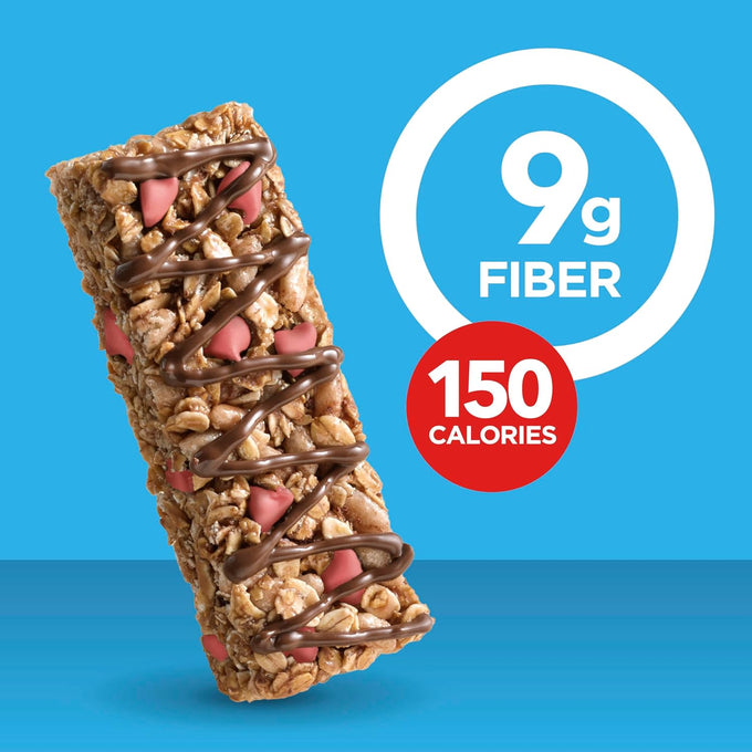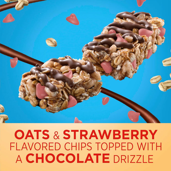 Chewy granola bars feature hearty oats, strawberry-flavored chips, and a smooth chocolate drizzle