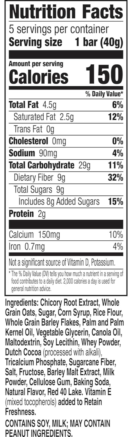 Ingredients: Chicory Root Extract, Sugar, Whole Grain Oats, Corn Syrup, Rice Flour, Whole Grain Barley Flakes, Palm and Palm Kernel Oil, Glycerin, Canola Oil, Maltodextrin, Soy Lecithin, Whey Powder, Tricalcium Phosphate, Sugarcane Fiber, Cocoa Powder, Salt, Fructose, Cocoa Processed With Alkali, Barley Malt Extract, Cellulose Gum, Baking Soda, Milk Powder, Natural Flavor, Red 40 Lake. Vitamin E (mixed tocopherols) Added to Retain Freshness.