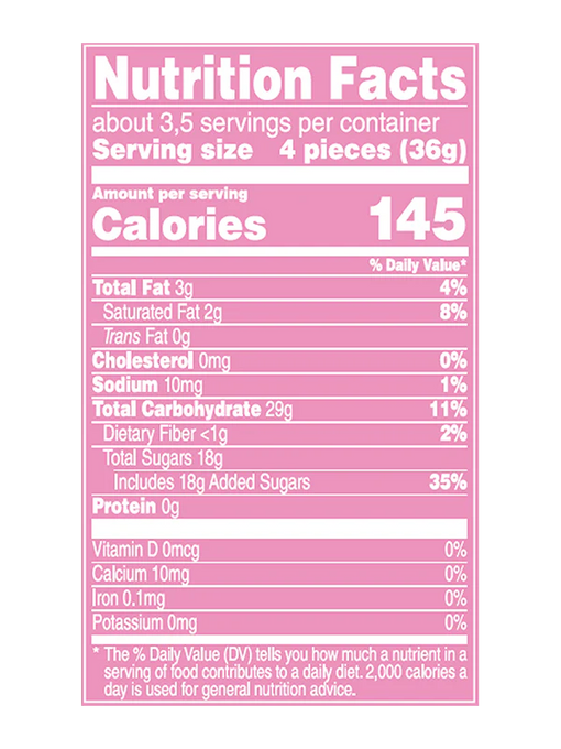 Ingredients: Glucose Syrup, Sugar, Palm Oil*, Coconut Oil, Acacia (Gum Arabic), Fruit Powders (Blackcurrant, Raspberry, Strawberry, Apple, Blueberry, Blackberry), Citric Acid, Natural Flavors, Hydrolyzed Rice Protein, Citric Acid Esters Of Mono- And Diglycerides, Ascorbic Acid, Color (Beetroot Red).