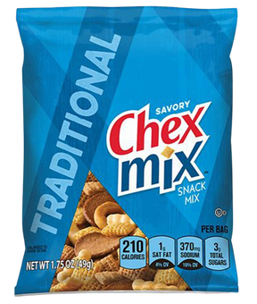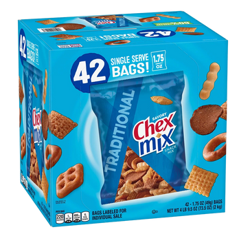 Enjoy a crunchy mix of salty and savory flavors with the Chex Mix Traditional Savory Snack Mix (42 pk.). This variety pack is filled with familiar favorites like Wheat Chex, bread twists and much more.