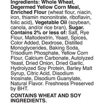Ingredients: Whole Wheat, Degermed Yellow Corn Meal, Enriched Flour (Wheat Flour, Niacin, Iron, Thiamin Mononitrate, Riboflavin, Folic Acid), Vegetable Oil (Soybean, Canola, And/Or Rice Bran), Sugar, Salt, Rye Flour, Maltodextrin, Yeast, Spices, Color Added, Dextrose, Distilled Monoglycerides, Baking Soda, Trisodium Phosphate, Yellow Corn Flour, Calcium Carbonate, Autolyzed Yeast, Dried Onion, Dried Garlic, Hydrolyzed Soy Protein, Barley Malt Syrup, Citric Acid, Disodium Inosinate, Disodium Guanylate, Natural Flavor.
