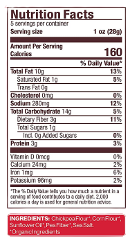 Ingredients: Chickpea Flour*, Corn Flour*, Sunflower Oil*, Pea Fiber*, Sea Salt. *Organic Ingredients