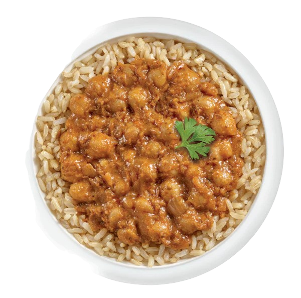 The Chickpeas & Rice Bowl features chickpeas slow-cooked with tomatoes, onions, and spices served over organic brown rice.