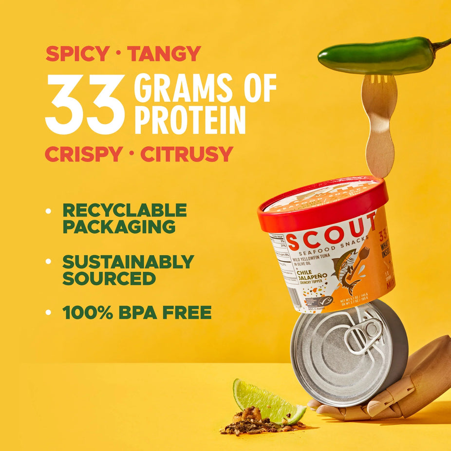 Scout is known for crafting premium, sustainably sourced seafood snacks with bold and vibrant flavors. Their Chile Jalapeno Crunchy Topper Seafood Snack combines the heat and zest of jalapeños with a satisfying crunch, inspired by the rich flavors of Mexico.