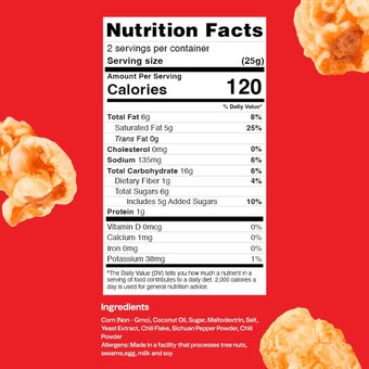 Ingredients: Corn (Non-gmo), Coconut Oil, Organic Cane Sugar, Maltodextrin, Salt, Yeast Extract, Chili Flakes, Sichuan Pepper Powder, Chili Powder.